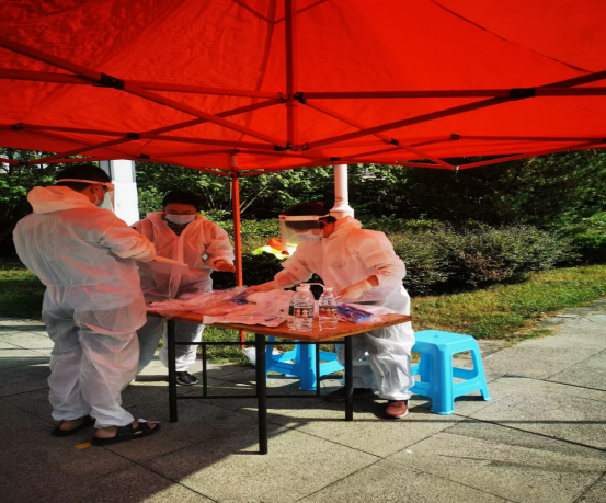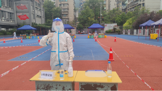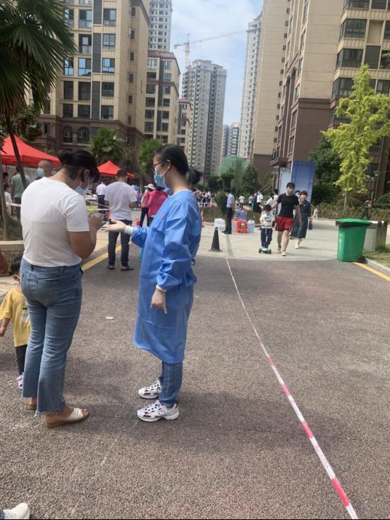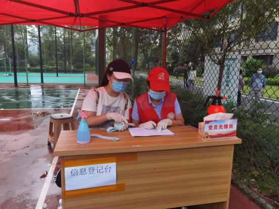 教工第二党支部副书记张泽玫在红星社区检测点当志愿者