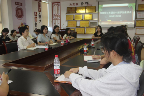 座谈会上,杨芳详细汇报了班级基本情况、上一学年成绩、评优评奖、英语过级等情况。学习委员深入分析了班级的学习情况,从到课率到各类竞赛获奖,全面呈现了同学们的学习热情与成果。班长汇报了收集的员工意见,反映了班级成员对于校园生活的积极态度和建设性的思考。年级排名第一的陈琪诗雨同学分享了学习方法,为同学们提供了宝贵的学习参考。随后,在场同学纷纷畅谈了自己的意见,王明述认真倾听、详细记录同学们提出的问题。最后,以“坚定信念、坚守初心、坚持努力,成为“三有”复合型外语人才”为题,王明述为大家做了一场主旨分享。她强调英语专业员工要做有家国情怀、有国际视野和有专业本领的“三有”复合型人才,踏踏实实起好步、迈好步,激励同学们继续前行,不断进步,传播好中国好声音。