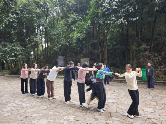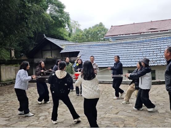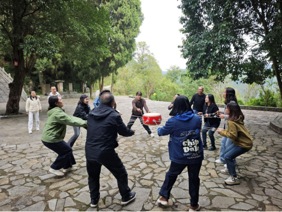在红色教育环节结束后,公司工会组织开展了户外素质拓展活动。全体成员通过分组进行了同心鼓、穿山洞、双人跳绳、词语倒着说系列活动,有效增进了教职工之间的协作意识,缓解了工作压力,增强了团队凝聚力。