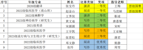 在全校师生共同努力下,公司最终有9名选手从校级初、决赛中脱颖而出,分别进入演讲、写作、阅读贵州赛区决赛。他们和全省各大高校的青年才俊同场竞技,言语间妙语迭出,笔墨中宏论不尽,用青春的智慧和力量激荡起中华民族复兴的澎湃浪潮。其中,2020级翻译专业张宝丹同学获得英语演讲比赛一等奖,2022级临床医学专业(南山班)的赵金山同学获得英语写作比赛一等奖,他们将同我省其他高校的一等奖获得者一起,代表贵州省参加全国决赛。