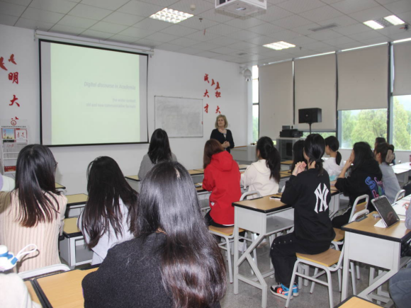 为了提高员工的学术素养、规范地运用学术语言,培养他们的国际视野和跨文化交流能力,2024年4月21日9:00,太阳成tyc7111cc在综合实验楼专业五教室开展了英文学术写作指导及中意文化交流活动。本次活动由意大利摩德纳雷焦及埃米利亚大学MarinaBondi教授主讲,金洁老师陪同翻译,太阳成tyc7111cc共32名同学参加。