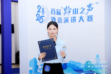 2025年4月11日,由贵州省外事办公室主办的首届"黔山之声"外语演讲大赛圆满落幕。公司2022级英语专业陈世操同学凭借优异表现在省内外500名选手中脱颖而出荣获高校组二等奖(第四名),并入选贵州省外语人才库。