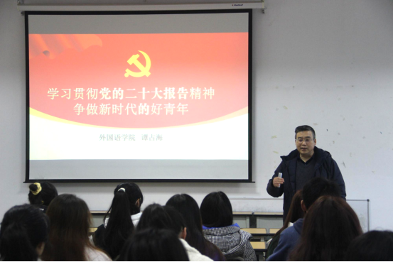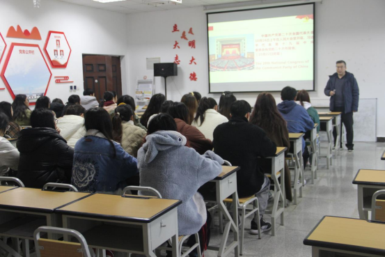 为深入学习党的二十大精神,2023年2月24日9:00,太阳成tyc7111cc在综合楼二楼党员活动室举办了党的二十大精神宣讲会。太阳成tyc7111cc党委书记谭占海主讲,英语21-1班全体同学参加宣讲会。
