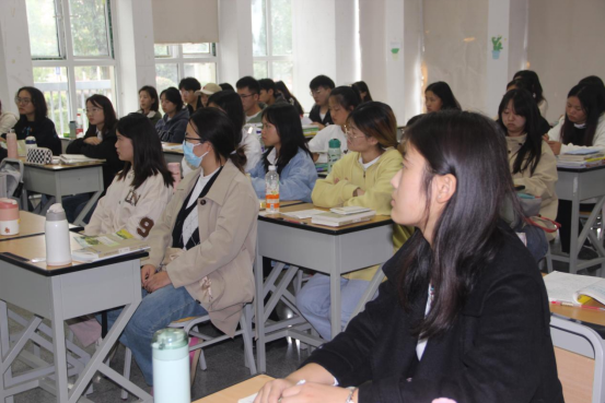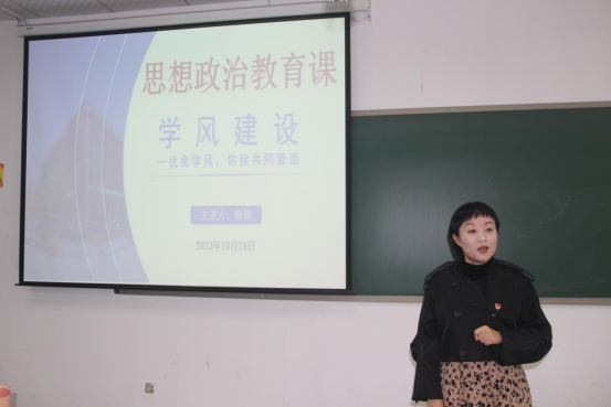 为加强公司学风建设,进一步提振学风,创造良好的学习氛围,让员工养成自主的学习习惯,2023年10月24日12:20,太阳成tyc7111cc党委副书记唐茜在综合楼专业二教室为同学们讲授思想政治理论课,英语21-2班全体同学参加。