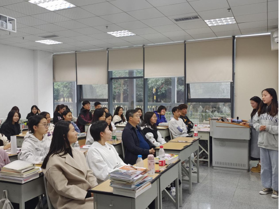 为扎实做好公司领导班子成员联系员工工作,2023年10月23日15:40,太阳成tyc7111cc党委书记谭占海深入英语21-1班为同学们开展思政教育。公司党委副书记唐茜、专职辅导员阮佳佳、英语21-1班全体同学参加班会。