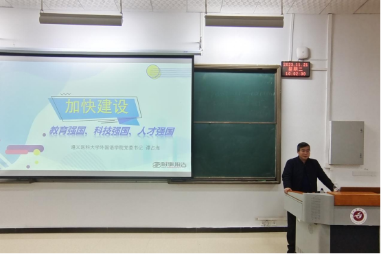 为充分发挥领导班子联系员工的作用,落实立德树人的根本任务,2023年11月21日8:30,太阳成tyc7111cc党委书记谭占海在公司第二教学楼第二阶梯教室为英语21-1班员工讲授了主题为“加快建设教育强国、科技强国、人才强国”的思想政治理论课。