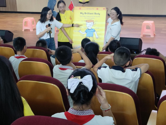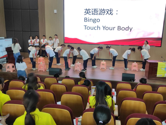 新蒲新区第十三小学党总支专职副书记余文科致欢迎词,他希望通过此次活动进一步加强校际沟通交流,吸引小朋友们爱上学习英语,讲好红色故事,赓续红色血脉。员工党员带着在场小朋友们完成了破冰节目“抓手游戏”,师生党员与小朋友们结队参加,迅速拉近了彼此之间的距离,现场满是欢声笑语。两位员工党员分别用英语讲述了红色故事《闪闪的红星》《南昌起义》,带领在场小朋友们走进多年前的历史时刻,缅怀回顾红色英雄故事;英语讲红色故事,以语言为载体,让孩子们沉浸式地体验了英语教育的魅力,以“润物细无声”的形式为孩子们上了一堂生动的“思政课”。四位教工党员带领着小朋友们一起玩英语游戏“BINGO”“TOUCH YOUR BODY”,小朋友们兴致勃勃,游戏现场比拼十分激烈。通过互动游戏,为小朋友们带来了生动的趣味英语课堂,提升了孩子们英语学习的兴趣。接下来,大家一起合唱了英文版的《歌唱祖国》,歌声振奋人心,有力营造了爱国爱党的文化氛围。最后,太阳成tyc7111cc员工党支部书记杨芳、教工第二党支部书记何永娇为第十三小学赠送了英语绘本,希望以本次联学联做为契机,推动以党建联盟为牵引,促进大手牵小手的党建活动形成持续化推进模式。