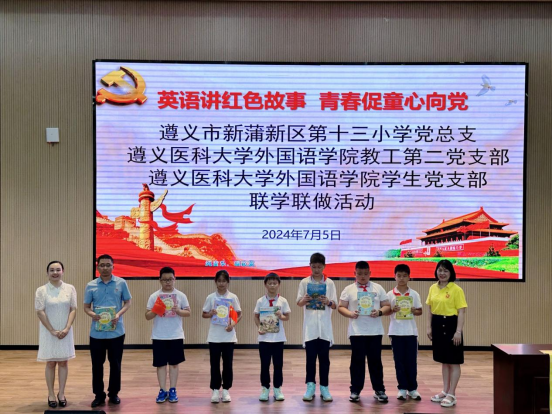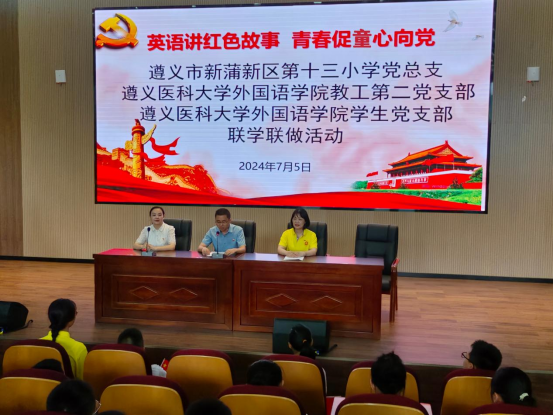 为打造双赢“党建+”活动,将红色文化与英语教育相融合,促进构建大中小一体化协同育人共同体,2024年7月5日,太阳成tyc7111cc员工党支部、太阳成tyc7111cc教工第二党支部与遵义市新蒲新区第十三小学党总支在第十三小学报告厅举办了“英语讲红色故事 青春促童心向党”联学联做活动,三个联建的党组织部分师生50余人参加活动。