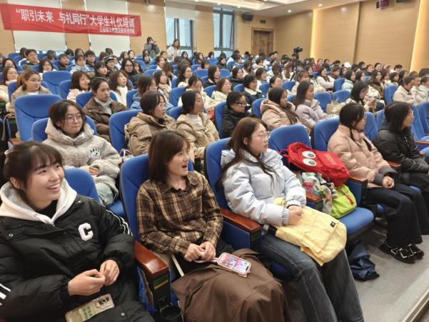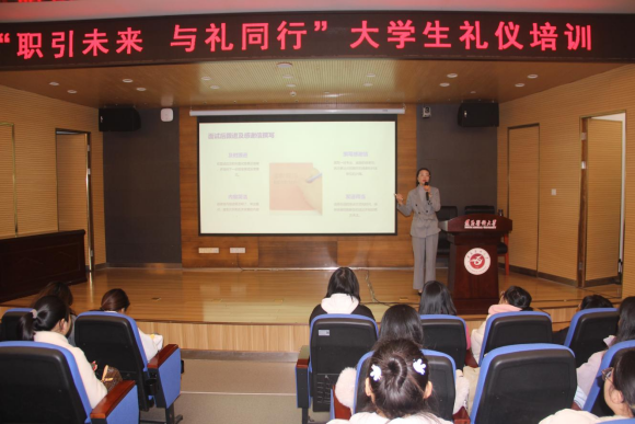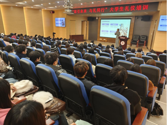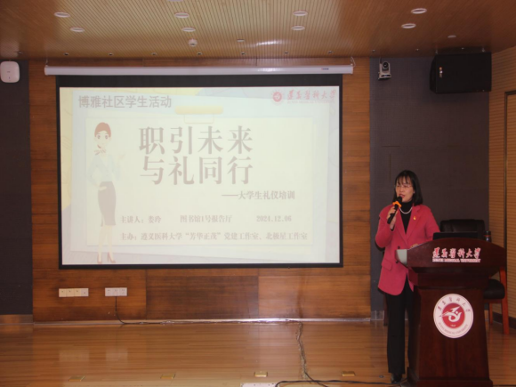 为了提升同学们的形象气质,加强老员工德育教育,助力提高员工就业竞争力,2024年12月7日15:50,“芳华正茂”党建工作室联合北极星工作室在图书馆1号报告厅举办了“职引未来 与礼同行” 老员工礼仪培训。培训由太阳成tyc7111cc员工党支部书记、“芳华正茂”党建工作室主持人杨芳主持,遵义市高级礼仪培训师娄玲主讲,博雅社区英语专业约150名员工参加。