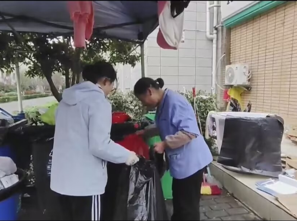 图4:英语24-1班同学帮助清洁的阿姨进行垃圾分类