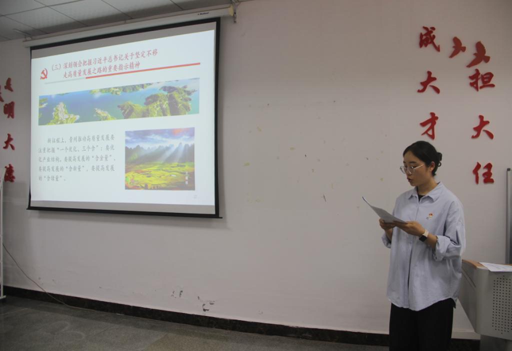 郑婉萍从习近平总书记在贵州考察重要讲话的背景和意义入手,详细阐述了讲话中的“两个特点”和“七个深刻领会把握”,深刻阐释了习近平总书记重要讲话的精神实质和丰富内涵。唐茜结合实践案例,从高质量发展、发展和生态、民生、党的建设等方面进行了系统的阐述和解读,并针对英语专业的员工未来发展和就业前景等进行了详细分析与指导。最后,唐茜带领全体同学一起学习了习近平总书记给谢依特小学戍边支教西部计划志愿者服务队队员回信,深刻领会习近平总书记对青年“听党话、跟党走”的嘱托,号召同学们“到祖国最需要的地方去”,为强国建设凝聚青春力量。