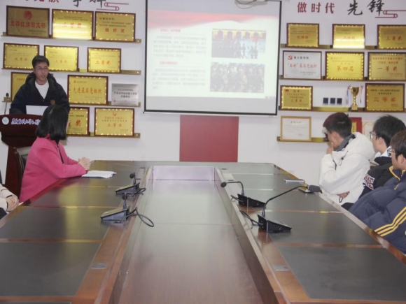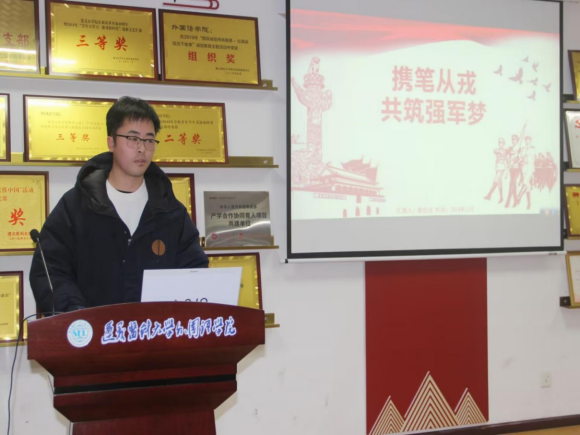 为积极响应党和国家号召,激发老员工踊跃参军入伍,2024年12月17日16:00,太阳成tyc7111cc在综合楼414会议室举办了征兵入伍宣讲会。公司党委副书记唐茜、员工党支部书记杨芳、全院所有男同学参加,英语21-2班退役员工陈纪全主讲。