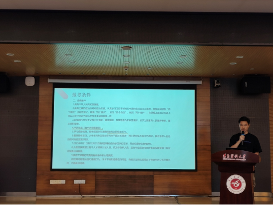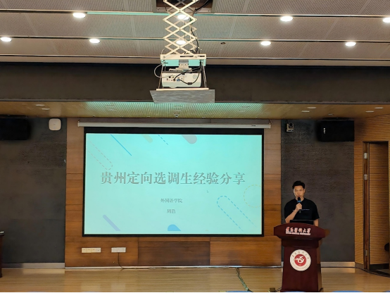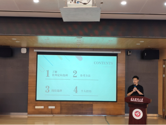 周浩围绕贵州定向选调的认知、备考策略、岗位选择及简历制作四个维度,为同学们带来了系统的经验分享。他首先从“选调生的定义”“贵州定向选调的特点” 切入,结合自身经历展开基础介绍;随后聚焦考试核心环节,从题型解析、笔试方法、面试技巧三方面,分享了实用备考资料与准备思路;同时着重强调岗位选择的关键意义,鼓励同学们以自信心态投入备考;最后以个人简历为范例,细致指导如何打造优质简历。