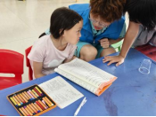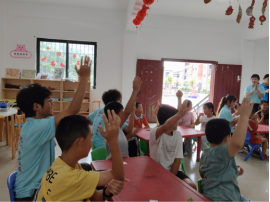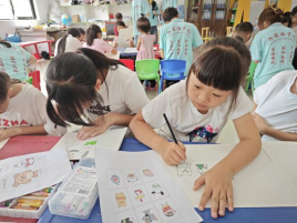 在动物英语单词学习环节,队员们借助动物卡片和趣味讲解,教小朋友认识动物单词,帮小朋友们加深印象。单词学会后,“盲盒谜语挑战”随即上线:队员在盲盒里准备谜语卡,小朋友们通过举手抢答,用英文说出对应的动物英语来获得小贴纸奖励。通过这种激励式学习方式,小朋友们都踊跃参与了谜语答题。
