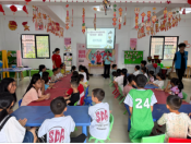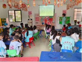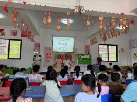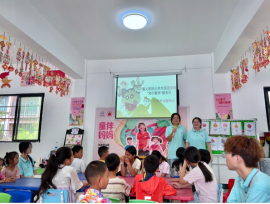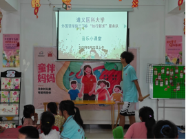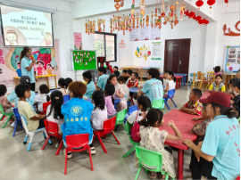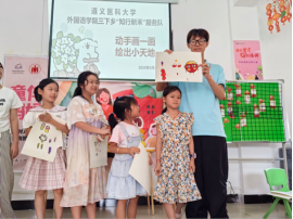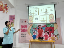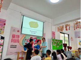 为了与小朋友们更快熟悉,队员们结合自身专业,从英语单词学习开始,开启了本次实践活动。队员们通过苹果、香蕉、柠檬等水果的图片,结合PPT展示,确保每个小朋友都能清晰跟读。单词教授完毕,立刻开启“水果蹲”游戏,现场满是欢快的笑声。