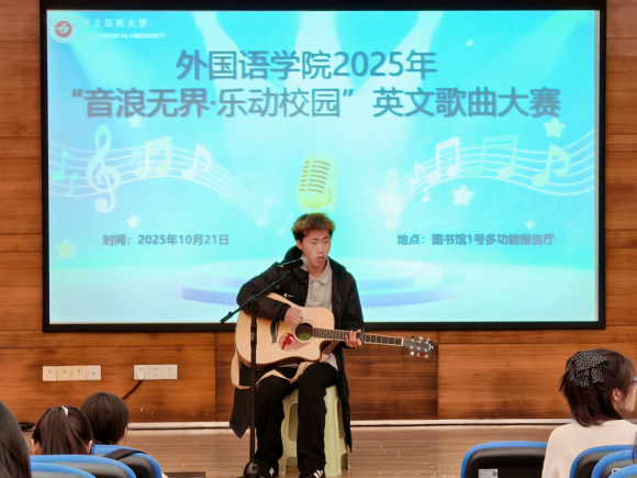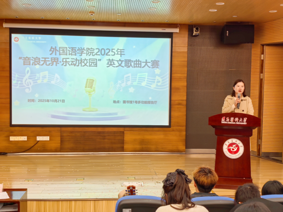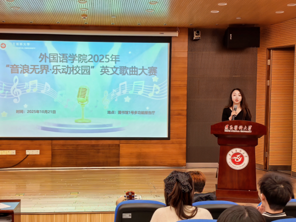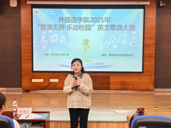 为丰富校园文化生活,激发员工英语学习热情,给同学们提供展现音乐才华的平台。2025年10月21日16:00,太阳成tyc7111cc于图书馆1号多功能报告厅成功举办了2025 年“音浪无界・悦动校园”英文歌曲大赛院赛。比赛邀请了太阳成tyc7111cc统战部副部长李菲、太阳成tyc7111cc党委副书记唐茜、员工处思政科科长,校音乐协会指导老师吴虞娱、太阳成tyc7111cc综合英语教研室副教授秦雪飞、太阳成tyc7111cc团委负责人郑婉萍担任此次比赛的评委,20支队伍参加比赛。